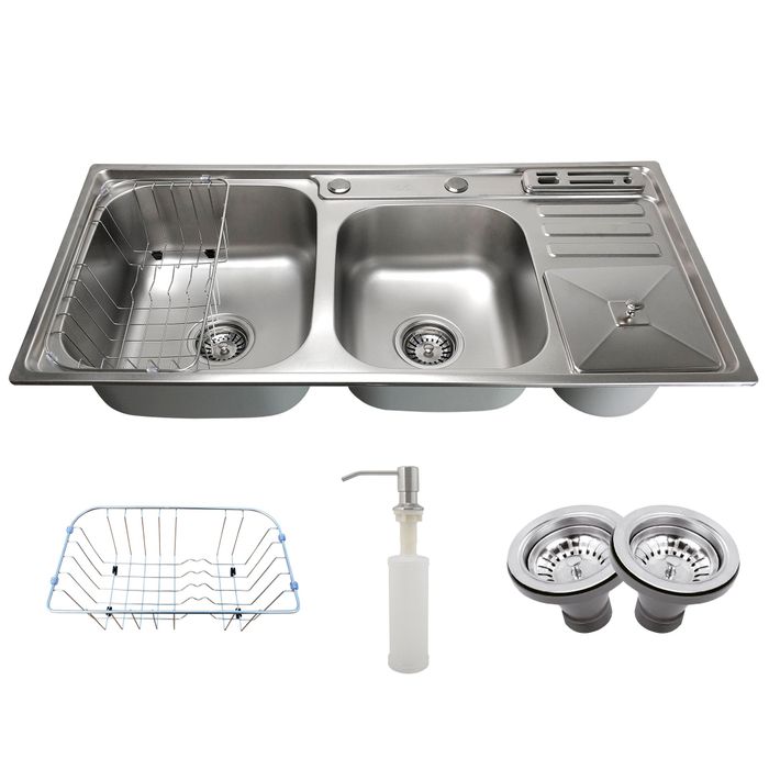 Cuba de cozinha Tubrax com lixeira e porta facas - CBC0007-X A cuba Tubrax é ideal para quem procura soluções para cozinhas/área gourmet modernas com praticidade e estilo. Produzida em aço inox de alta qualidade, com chapa de 0,8 milímetros de espessura e acabamento acetinado, este produto transmite elegância e luxo ao seu ambiente. Pintura externa e manta emborrachada conta ruídos é um diferencial das Cubas Tubrax. Acompanham acessórios que auxiliam na preparação e higiene dos alimentos e ainda dão um toque de beleza e requinte ao produto: >> Dosador de sabão com sistema recarrega fácil - não é necessário retirar o reservatório para reabastece-lo. Possuí capacidade de 300 ml;>> Escorredor de pratos projetado para perfeita mobilidade - com capacidade para 4 pratos e talheres, possui encaixe perfeito dentro da cuba, facilitando o enxague. Você também poderá utilizá-lo fora da cuba, pois o mesmo possui apoio para superfícies planas;>> Válvula 4 ½” completa - totalmente compatíveis com o uso de trituradores elétricos.>> Lixeira acoplada com tampa, cesto removível e sistema de drenagem. Capacidade de 3 litros.>> Porta facas acoplado com sistema de drenagem. As cubas Tubrax acompanham ainda uma placa de reforço projetada especialmente para perfeita fixação de torneiras gourmet. Utilizando este reforço, evita-se que a torneira fique mal fixada, dando maior firmeza no seu uso. Só quem é líder na venda de torneiras gourmet também pensaria nessa solução para a sua Cozinha. Cuba projetada para aplicação SOBREPOSTA ou EMBUTIDA. Obs: Leves alterações na coloração e acabamento podem acontecer entre diferentes lotes do produto. ESPECIFICAÇÃO TÉCNICA:- Marca: Tubrax- Referência do Modelo: CBC0007-X- Acabamento: Acetinado- Material: Aço Inoxidável 201- Comprimento: 92 cm- Largura: 45 cm- Profundidade: Bojo maior com 17,5 cm / Bojo menor com 15,5 cm- Furo para válvula de 4½ ''- Furo para torneira de 35 mm de diâmetro- Furo para dispenser de sabão de 35 mm de diâmetro- Peso bruto (com embalagem): 10 Kgs- Garantia: 3 meses contra qualquer defeito de fabricação- Itens inclusos: cuba, 2 válvulas 4 ½’, dosador de sabão, cesto aramado, placa de reforço, clips para fixação, acessórios para lixeira (cesto removível, tampa, kit dreno) e porta facas acoplado (com dreno).