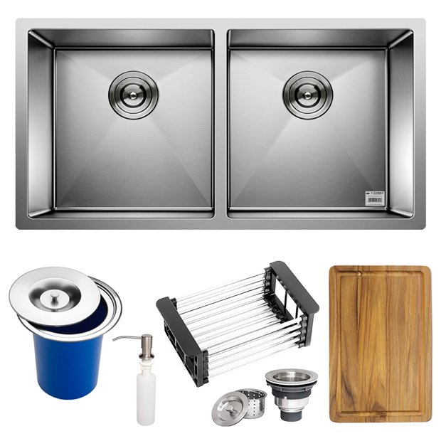 Cuba Dupla Quadrada Inox 304 Cozinha Pia Embutir Sobrepor Gourmet 88x40 Premium com Lixeira de Embutir 5L, Tábua Multiuso e Acessórios