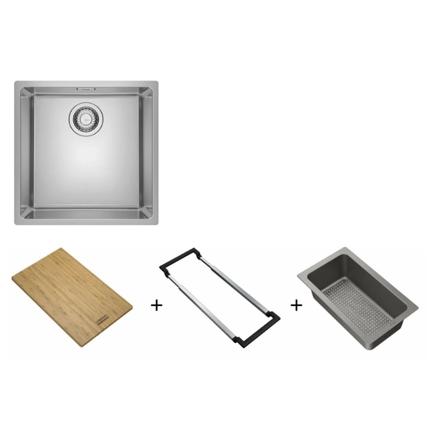 • Agora você pode desfrutar dos itens do premiado Conjunto ALL-IN Franke: a guia telescópica em aço inoxidável, a tábua de corte em bambu e o cesto escorredor grande termoplástico sanitizado. Juntos formam um conjunto perfeito com a linha de cubas línea da Franke.