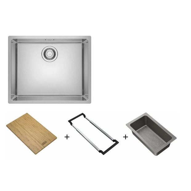• Agora você pode desfrutar dos itens do premiado Conjunto ALL-IN Franke: a guia telescópica em aço inoxidável, a tábua de corte em bambu e o cesto escorredor grande termoplástico sanitizado. Juntos formam um conjunto perfeito com a linha de cubas línea da Franke.
