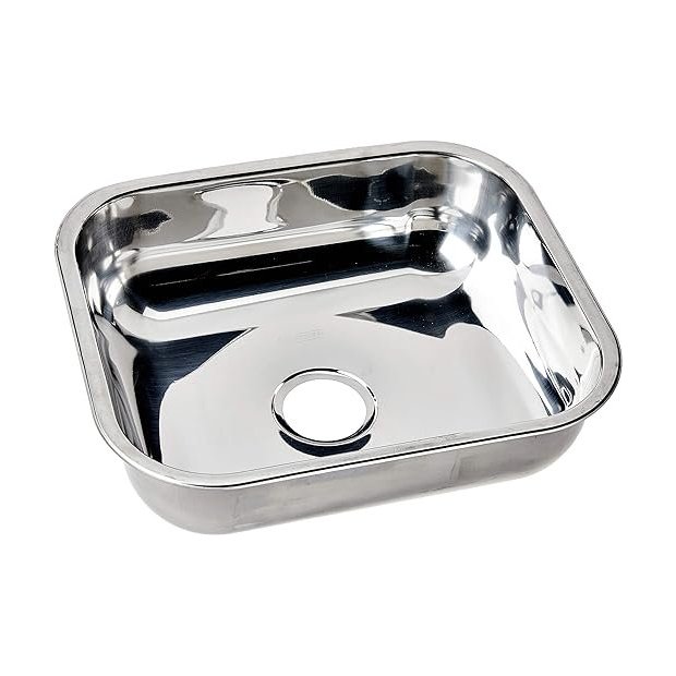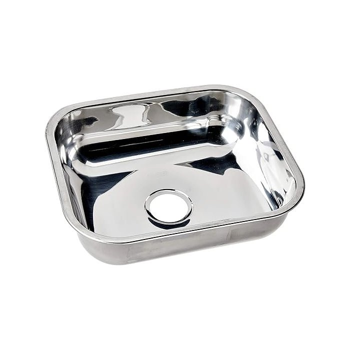 Cuba retangular fabricada no Brasil. Material: fabricada em aço inox 430 e acabamento polido. Abas reforçadas que permitem instalaçõespor baixo e por cima da pedra.