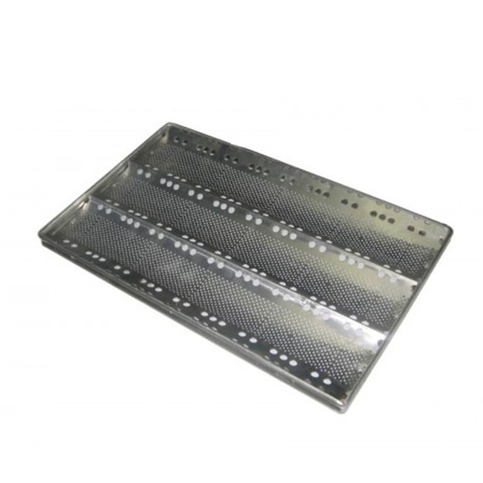 Bandeja ondulada perfurada quadrada com 4 calhas, dobrada em material alumínio liga com espessura de 0,80 mm, para acondicionamento e cozimento de massas alimentícias. Bandeja perfurada com furo Ø 2,5 mm. A facilidade de limpeza e higienização da bandeja plana perfurada sem rebarbas a torna ideal para padarias, restaurantes, bares, lanchonetes, hotéis, e cozinhas industriais. O alumínio liga é um material de alto desempenho, proporcionando o melhor resultado na sua utilização. Além disso, este produto tem o melhor custo-benefício para empresas, pois sua durabilidade ultrapassa anos de uso intenso.