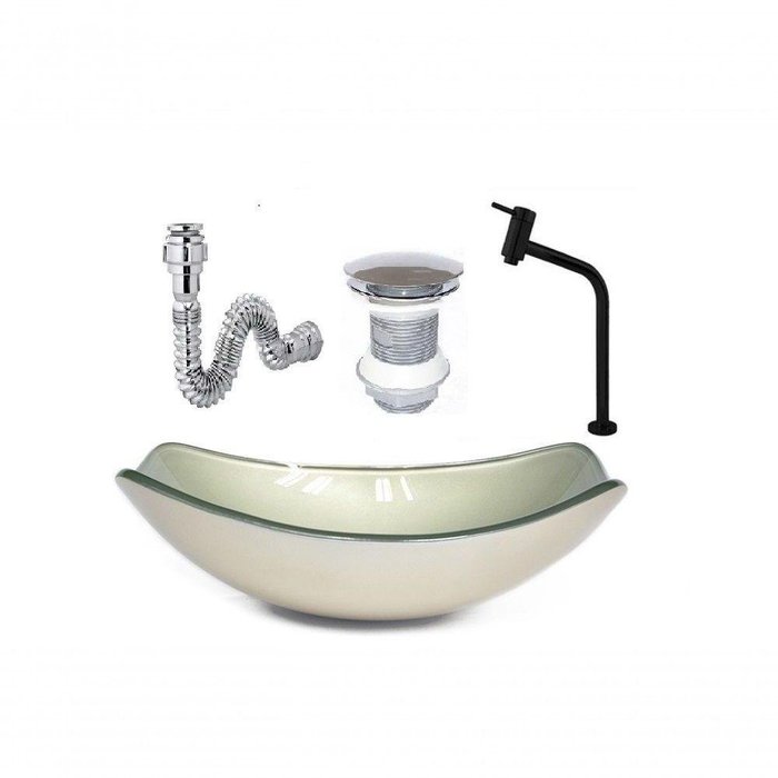 Cuba De Vidro Oval Chanfrada 46cm Champanhe + Valvula + Torneira Metal Preta + Sifao