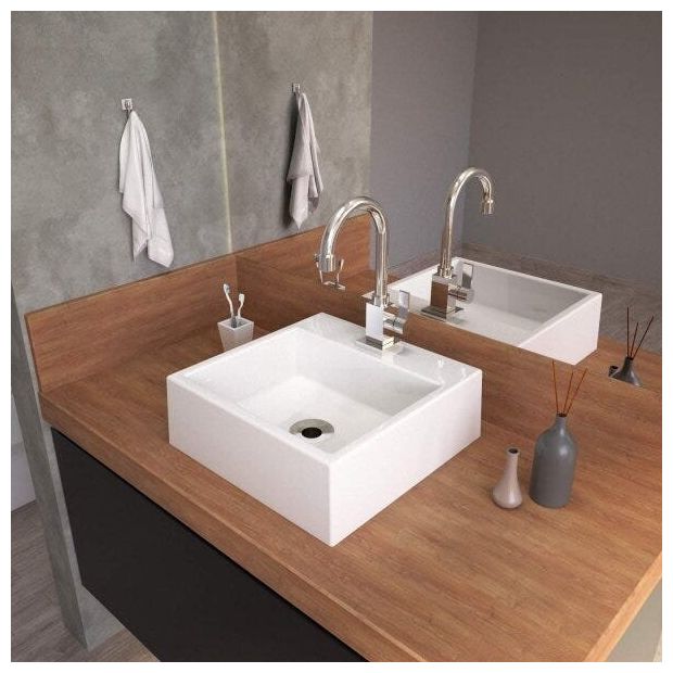 A cuba Q355 Compace tem seu design quadrado e um excelente escoamento de água. Fabricada em mármore sintético com acabamento em gel coat, material bem semelhante a louça, muito resistente e mais econômico.