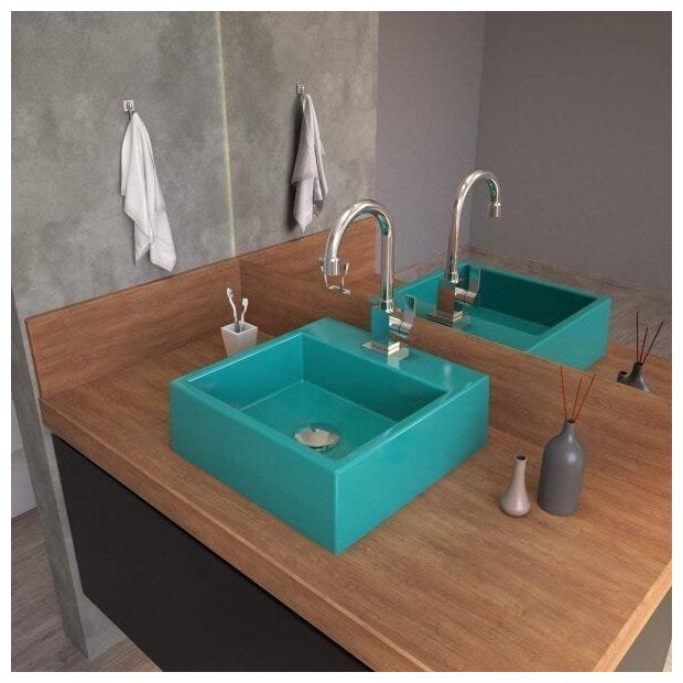 A cuba Q355 tem seu design quadrado e um excelente escoamento de água. Fabricada em mármore sintético com acabamento em Hard Lacca PU, material bem semelhante a louça, muito resistente e mais econômico.