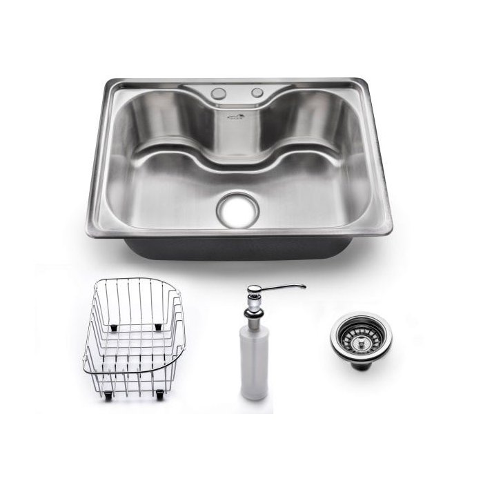 Este produto acompanha a válvula 4 1/2" (copo + grelha), dosador de sabão e cesto aramado com escorredor de pratos.