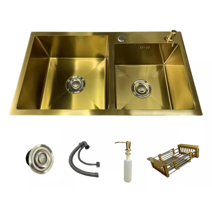 Cuba Pia Dupla Gourmet Quadrada Dourada Cozinha Aço Inox 304 com Acessórios 75x40cm