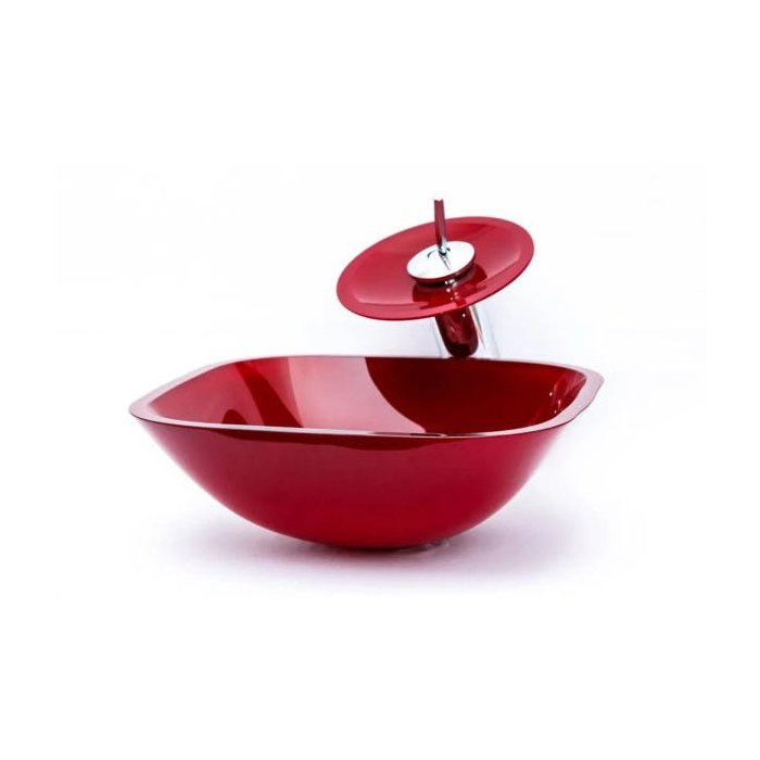 Cuba Vidro Quadrada 36Cm + Torneira Cascata + Válvula + Sifão - Vermelho