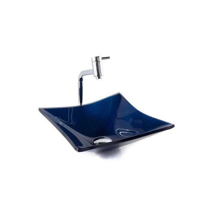 Cuba Vidro Quadrada RT 30Cm + Torneira Link + Válvula + Sifão - Azul escuro - 30 x 30 x 11 Cm