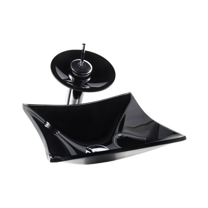 Cuba Vidro Quadrada RT 34Cm Preto + Torneira Cascata + Válvula