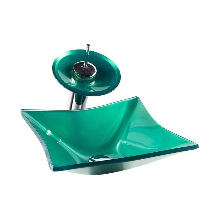 Cuba Vidro Quadrada RT 34Cm Verde + Torneira Cascata + Válvula