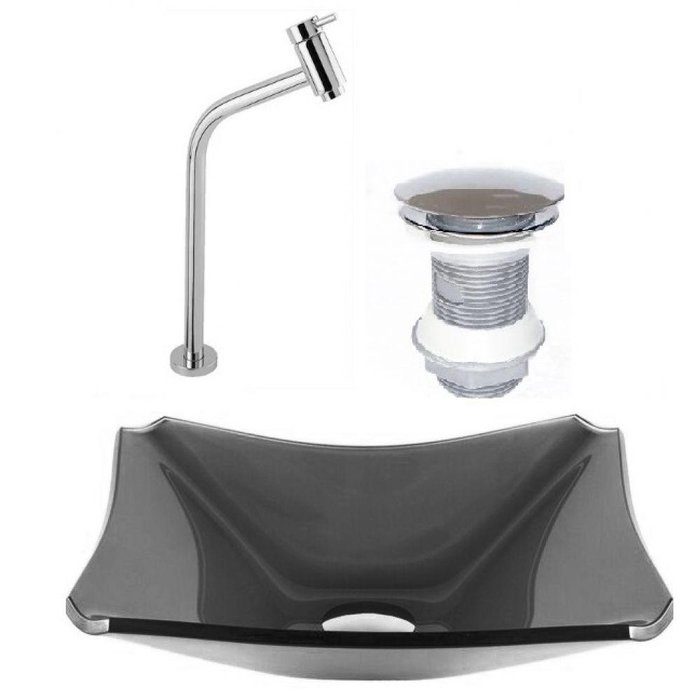 Cuba De Vidro Retangular Chanfrada 37cm Grafite + Válvula Click + Torneira