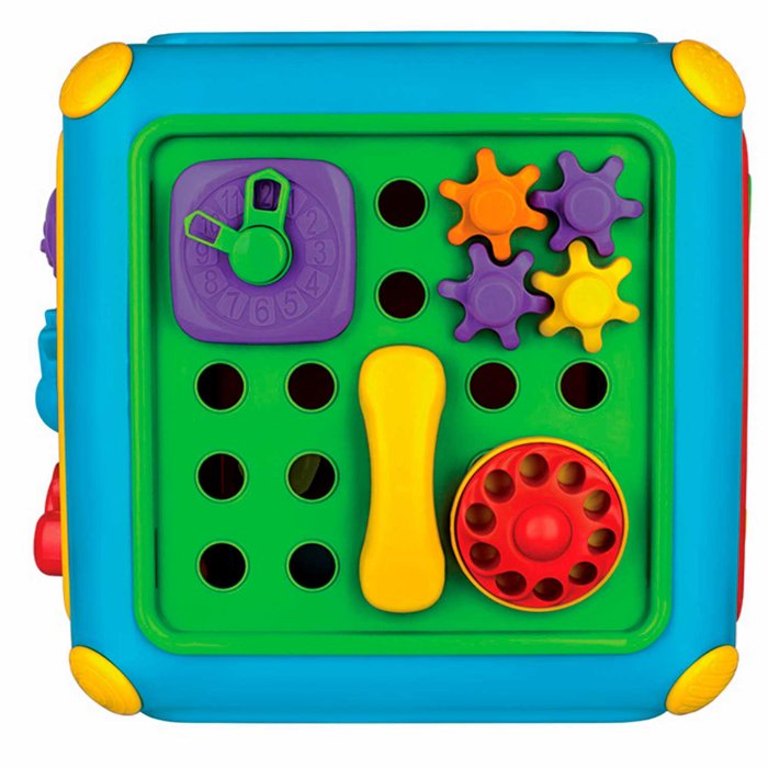 Em um lado, o cubo acompanha um painel com luzes e sons de animais, para os pequenos reconhecerem e diferencia-los. No outro, encontramos um painel de múltiplas atividades que contribui na percepção de formas, cores e movimentos.