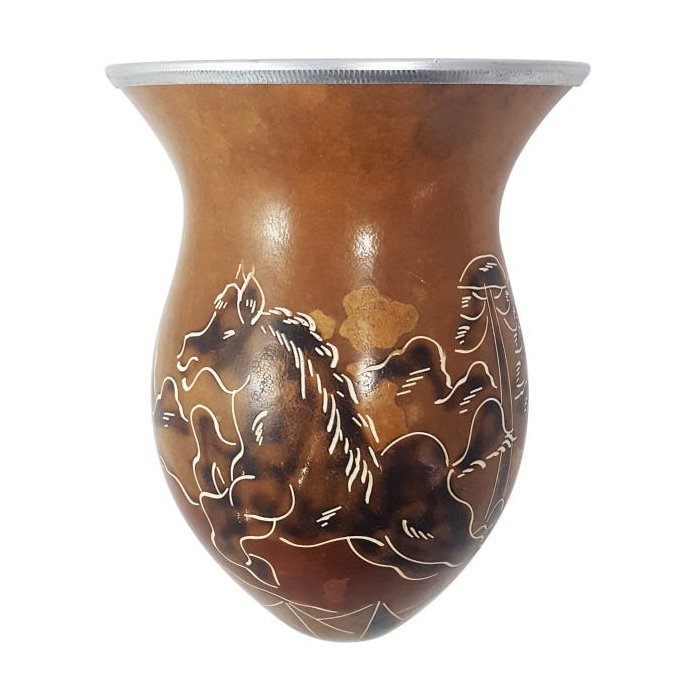 Aprecie bons momentos desfrutando seu chimarrão com uma cuia de qualidade. Confeccionada com porongo natural e toda desenhada com temas campeiros como cavalos e paisagens do campo é perfeita para você que gosta da tradição do mate e da lida do campo. Esta cuia possui bocal em acabamento de alumínio é de tamanho médio ideal para servir o mate aos amigos e conversar. Desfrute do seu chimarrão diariamente com uma cuia tradicional gaúcha.