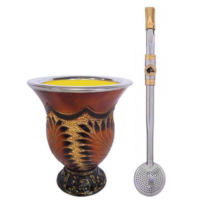 Este kit é ideal para quem consome chimarrão diariamente. Cuia com curvatura superior, bocal coberto com aço inox, estampa produzida artesanalmente de flor ou floreira. Bomba banhada em ouro 18k, escolha o seu desenho preferido, Brasão ou Cavalo. Bojo com sistema de rosca, acompanha escovinha que facilita na hora da limpeza. Excelente opção para presentear aquele seu amigo companheiro das mateadas.