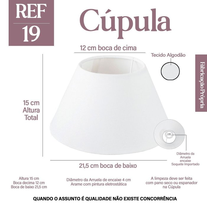 Descubra a harmonia perfeita entre design elegante e qualidade excepcional. Nossa cúpula é confeccionada com o mais puro algodão, proporcionando uma textura suave e agradável ao toque, além de trazer um charme acolhedor a qualquer ambiente.