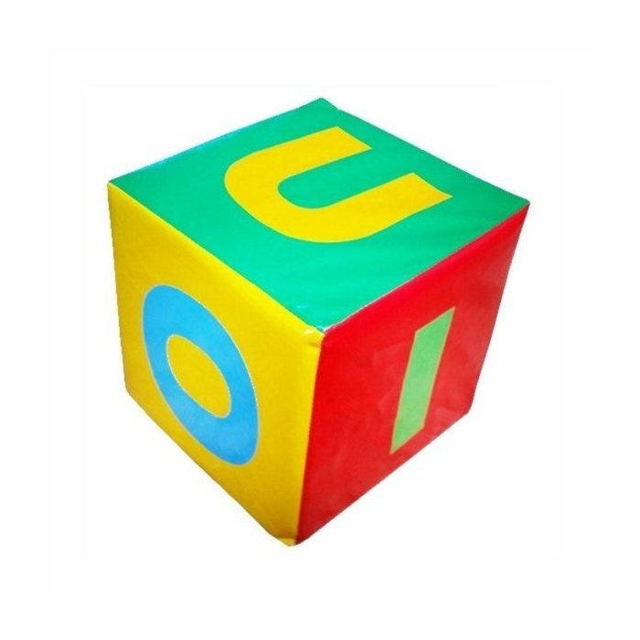 Dado feito de espuma de alta densidade, cada lado possui uma vogal, revestido em bagum brilhante.