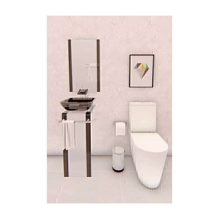ITENS INCLUSOS: Torre e bancada de vidro, Cuba de vidro quadrada, espelheira, Porta- toalhas, Válvula Click Cromada, Torneira Cascata Quadrada e Kit de Instalação.