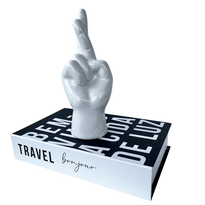 Decoração sala quarto rack aparador livro caixa porta objetos branco/preto travel bonjour decor + enfeite escultura mão na cor branca cruzando os dedos gesto figa de cerâmica.