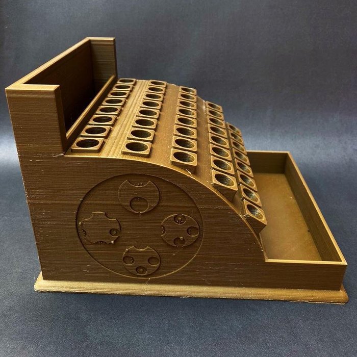 Porta pincéis que comporta 40 unidades. Além disso oferece compartimento para papeis em geral. Essa caixa vintage e robusta pode dar um toque especial ao seu ateliê ou mesa de escritório. Esta peça foi impressa em PLA bronze.