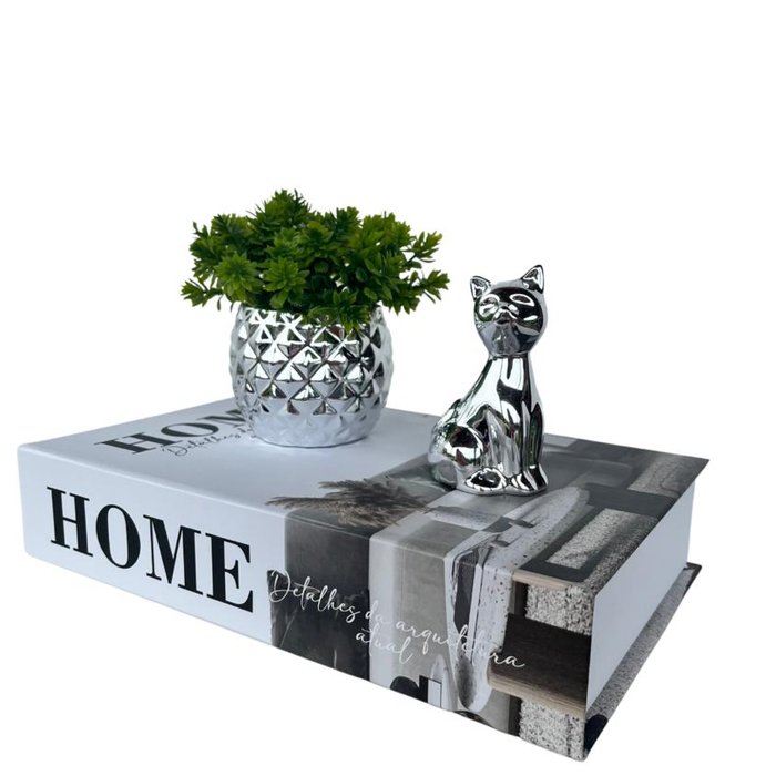 Nada mais encantador, original e inspirador do que utilizar livros na decoração de diversos ambientes, como salas de estar, escritórios, quartos, home office e onde mais sua imaginação permitir. Os livros decorativos são a mais nova tendência na decoração contemporânea e permitem diversas combinações e utilizações, dando um ar de sofisticação em mesas de centro, aparadores, prateleiras, escrivaninhas etc. Esse lindo livro estampa 'Home', irá encantar você pela riqueza de detalhes e qualidade no acabamento, junto do vaso cachepô prateado e enfeite gato que dão um toque todo especial no ambiente.