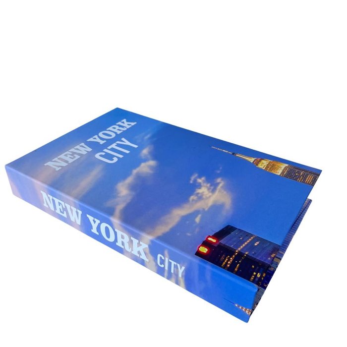 Decoração sala rack aparador livro caixa fake decorativo porta objetos New York City azul viagens com tampa que abre.