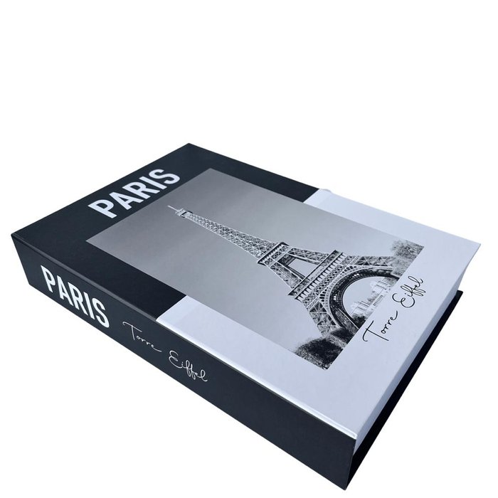 Decoração sala quarto aparador livro caixa fake grande porta objetos Paris Torre Eiffel preto branco com tampa que abre.