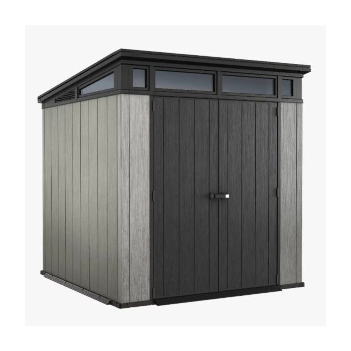 Um lindo depósito Artisan Keter externo de 2,26m de altura com design rústico e contemporâneo com textura de madeira. A tecnologia DUOTECH!22 permite que pinte e personalize conforme sua preferência, estrutura com reforço extraforte em aço inoxidável e parede dupla de total segurança, sendo perfeito para armazenamento para todas as suas necessidades, possui janelas cristalinas, claraboia no teto, portas com abertura duplas, piso e teto robustos que suportam cargas pesadas e é resistente as mais altas e baixas temperaturas, até neve!