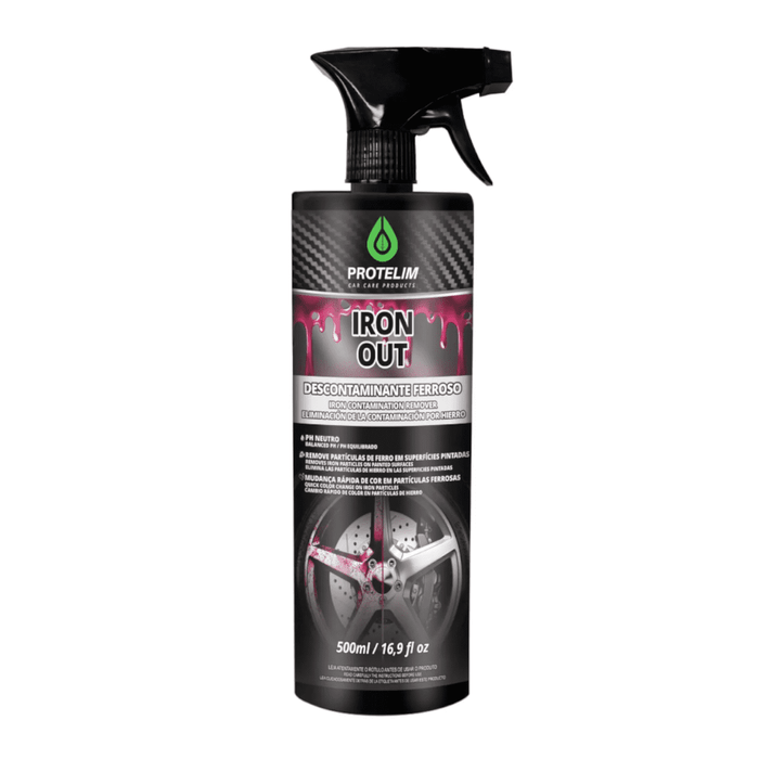 IRON OUT é um descontaminante ferroso de alta tecnologia, indicado para remover e descontaminar fuligens e partículas de freios oxidados. O produto tem ação profunda, agindo nas baixas camadas de diferentes superfícies como: rodas, vidros, latarias, verniz, pinças de freio, motores e partes metálicas. Com altíssimo poder de limpeza, age profundamente na remoção dos pontos mais difíceis, transformando-os em componentes solúveis. O IRON OUT possui um pH neutro, podendo ser utilizado em diversas superfícies na remoção de partículas ferrosas.