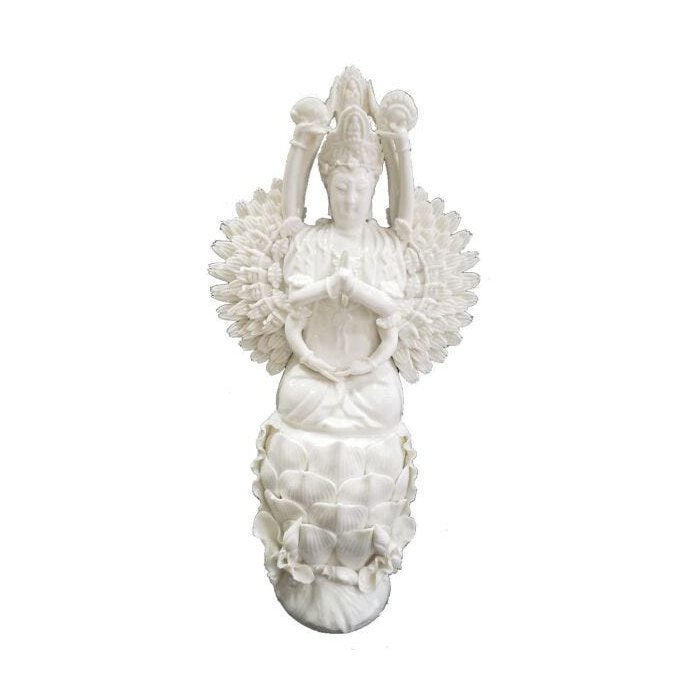 Deusa Kuan Yin das 1000 mãos, feita em porcelana, dimensão de 32cm de altura x 16cm de largura X 7cm de profundidade.