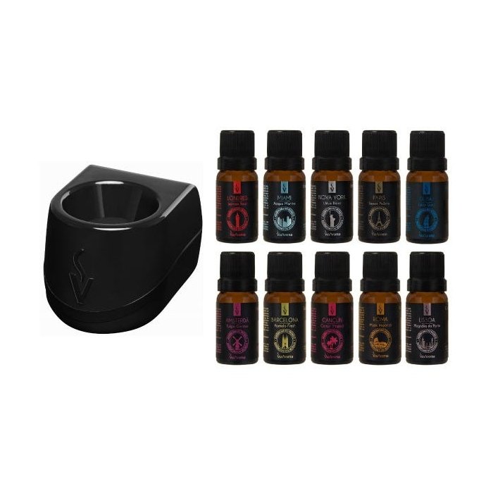 Kit 1 aromatizador difusor via aroma standard black (plástico) + 10 essências linha mundo 10ml via aroma