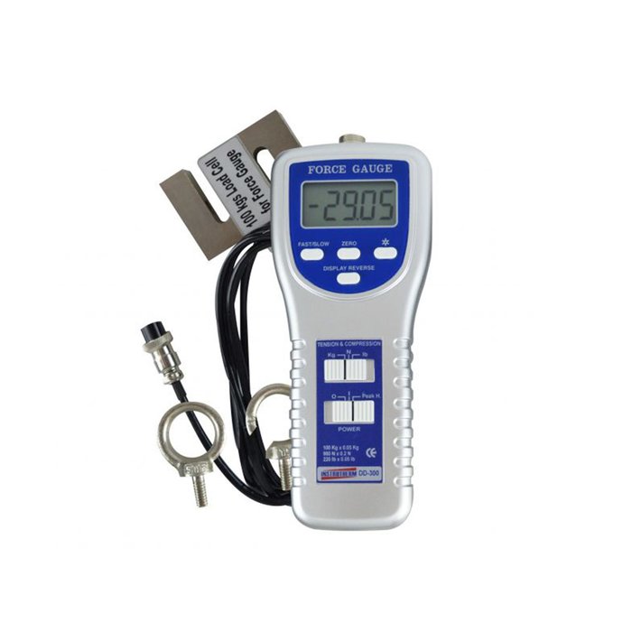 O dinamômetro Digital Portátil mod. DD-300 possui as escalas 100Kgf, 220LBf, 980N. Conta com saída de dados serial RS-232, Display de Cristal Líquido (LCD) retroiluminado de 5 dígitos; tensão e compressão (Push & Pull); Seleção de Unidade; Taxa FAST/SLOW e PEAK HOLD, Função de zero em operação Normal Force ou Peak Hold.