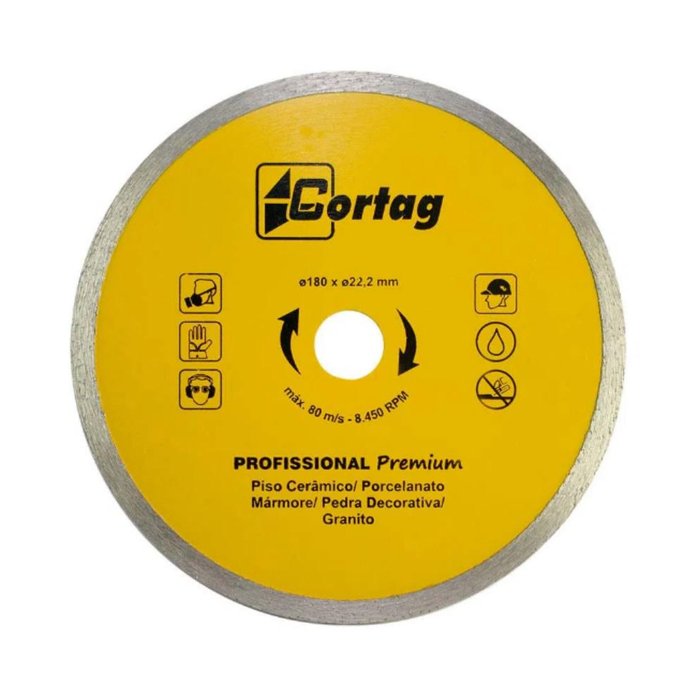 Características da Ferramenta: Disco Diamantado Profissional Premium Perfil: continuo Tipo de corte: Refrigerado Indicado para uso no Cortador Elétrico ZAPP 180 Aplicação: Cerâmica, Mármore, Granito e Pedras decorativas Imagem Meramente Ilustrativa Dados Técnicos: Diâmetro do disco: 180mm Diâmetro do furo: 22,2mm Peso: 0,35 Kg Rotação: 8.450 rpm Acompanha: 1un. Disco de Corte Diamantado Continuo 180x22,2mm Cortag Garantia: