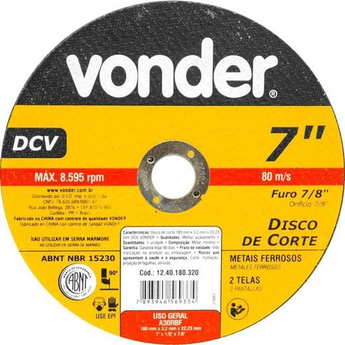 Aplicações e dicas de uso: Indicado para serralheiros e demais profissionais em geral. Ideal para cortar aços e materiais ferrosos (barras, tubos e chapas), manutenções e reparos leves. Não utilizar em serra mármore. Destaques e diferenciais: Possui excelente performance em trabalhos intermitentes Características Técnicas:Diâmetro do disco de corte: 180 mm - 7" Espessura do disco de corte: 3,2 mm - 1/8" Diâmetro do furo do disco de corte: 22,23 mm - 7/8" Número de telas do disco: 2 Grão: G 30 Rotação máxima do disco (rpm): 8.595 rpm Norma de referência: ABNT NBR 15230Garantia legal: 90 dias Produto: Disco