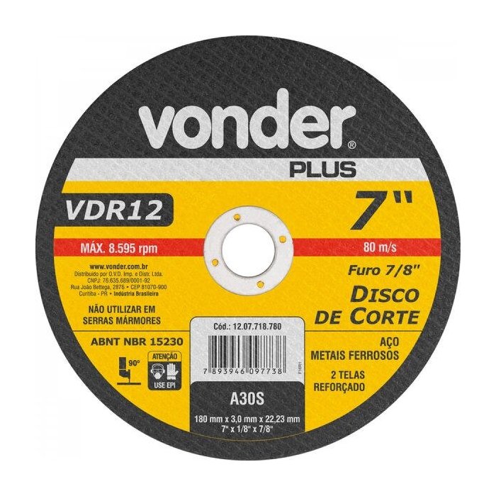 Disco de corte 180 mm x 30 mm x 2223 mm VDR12 Vonder PLUS