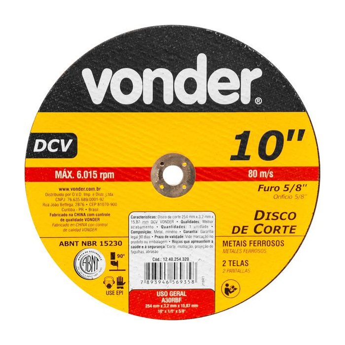 Conteúdo da Embalagem:1 Disco de corteDescrição:Disco de corte 254 mm x 3,2 mm x 15,87 mm DCV VONDER Aplicações e dicas de uso: Indicado para serralheiros e demais profissionais em geral. Ideal para cortar aços e materiais ferrosos (barras, tubos e chapas), manutenções e reparos leves. Destaques e diferenciais: Possui excelente performance em trabalhos intermitentes Características Técnicas:Diâmetro do disco de corte: 254 mm - 10" Espessura do disco de corte: 3,2 mm - 1/8" Diâmetro do furo do disco de corte: 15,87 mm - 5/8" Número de telas do disco: 2 Grão: G 30 Rotação máxima do disco (rpm): 6.015 rpm Norma de referência: ABNT NBR 15230Garantia legal: 90 dias