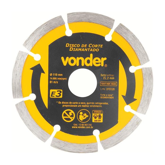 Conteúdo da Embalagem:1 Disco de corte diamantadoDescrição:Disco de corte diamantado, 110 mm, furo de 22,2 mm, segmentado, E3, VONDER Aplicações e dicas de uso: Indicado para cortar mármore, granito, concreto, tijolo, telha, alvenaria e pedras. Os discos de corte a seco, quando refrigerados, proporcionam um melhor rendimento. Destaques e diferenciais: Proporciona qualidade e produtividade na operação. Acompanha bucha de redução de 20 mm. Características Técnicas:Diâmetro externo do disco de corte diamantado: 110 mm Diâmetro do furo do disco de corte diamantado: 22,2 mm Tipo de corte do disco de corte diamantado: A seco Perfil do corte: Segmentado Rotação máxima (rpm): 14000 /min Segue norma: ABNT NBR 15545Garantia legal: 90 dias