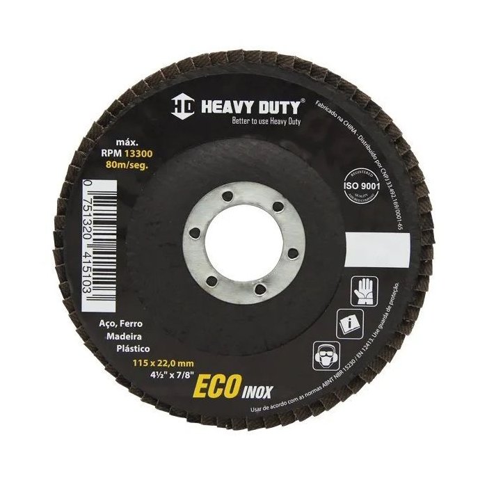 O DISCO FLAP ECOINOX FIBRA RETO 4.1/2 GRANA 60 da Heavy Duty é um produto utilizado em lixadeiras e esmerilhadeiras angulares. Realiza o desbaste e o acabamento ao mesmo tempo. É indicado para operações em metais ferrosos e não ferrosos, aços carbono e de construção.