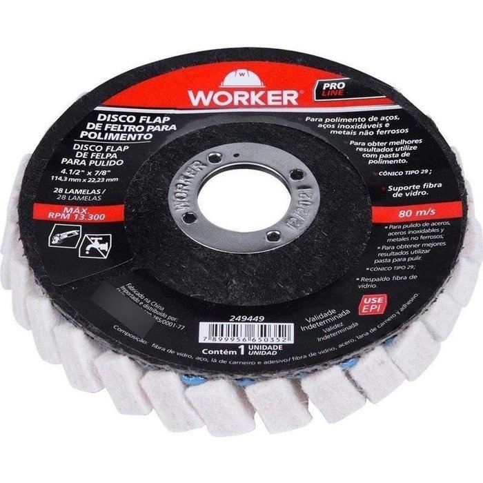 CONTEÚDO DA EMBALAGEM:- 1 Disco Flap de Feltro para Polimento de Metal e Inox 4.1/2"x7/8" 13300 r.p.m. - Worker - 249449;