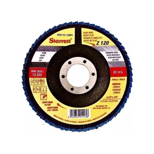 Disco Flap Fibra de Vidro Cônico 115x22,23mm (4 1/2x7/8) Grão 120Os Discos de Flap Starrett® são fabricados de acordo com as Normas ABNT NBR 16195 e ABNT NBR ISO 15635 com grãos de zircônio de alta performance. Contando com formato cônico e lixa individual, oferece maior remoção.CaracterísticasDiscos com suporte em fibra de vidro e formato cônico.Grãos de zircônio proporcionam maior vida útil.Ótimo custo-benefício com excelente taxa de remoção de material.Desbaste e acabamento na mesma operação, reduzindo o tempo e custo no processo.Menor ruído e vibração.AplicaçõesAplicável em operações de desbaste, remoção de solda e acabamento em aço inox, alumínio, metais ferrosos e não ferrosos com esmerilhadeiras angulares.Preferencialmente utilizado em superfícies curvas e cantos devido ao seu formato cônico, proporcionando ótimo acabamento.Ângulo de trabalho de 15° a 25º.Descrição: