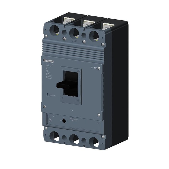Disjuntor 3VJ1 Framesize IEC 3VJ13 Proteção de linha 400A ATFM 3 polos Icu=36kA@415V Ics=75% Icu In=400A proteção contra sobrecarga Ir=320A..400A proteção contra curto-circuito Ii=10 x In Conexão a parafuso.