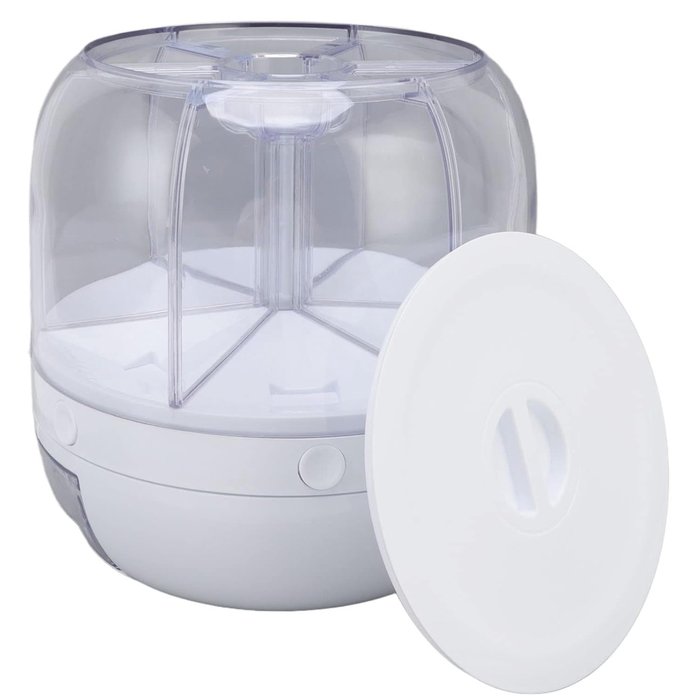 O Dispenser possui botão para facilitar a abertura, basta girar até o alimento desejado e pressionar um botão para abrir o recipiente.