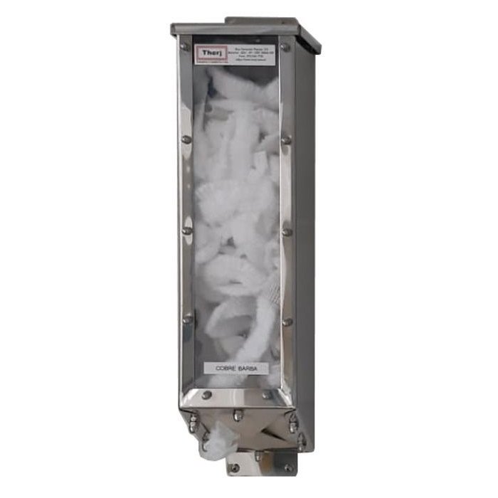 Dispenser com visor frontal para toucas e pro pés fabricado em aço inoxidável para fixação a parede, indicado na utilização em hospitais, pronto socorros, clínicas e laboratórios e indústrias