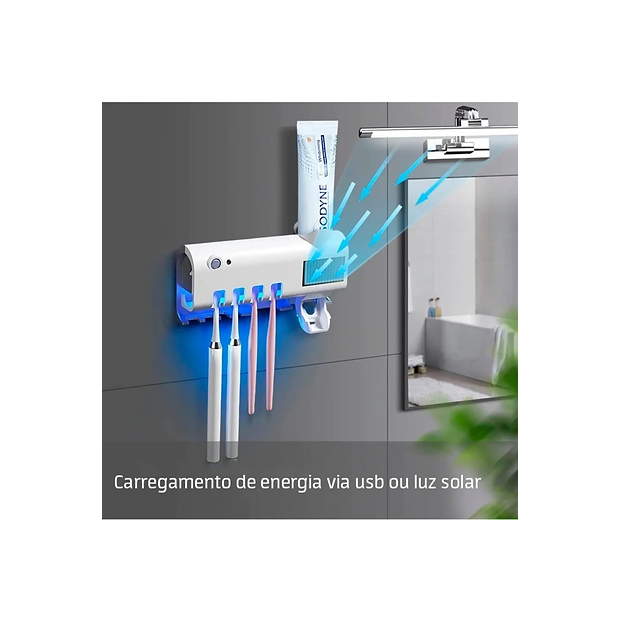Uma boa escovação não basta para manter sua saúde bucal, sua escova de dentes também precisa de um cuidado especial para se manter livre de germes e bactérias.Ao ficar exposta no banheiro sua escova está suscetível a milhares de microrganismos que podem causar sérias infecções bucais, inclusive os que são espalhados pela descarga do vaso sanitário. E apenas guardar com aquelas capinhas não adianta, pois elas inibem a circulação do ar mantendo a escova abafada e facilitando assim a proliferação de germes, bactérias e bolor.O Dispenser com esterilizador UV mantêm sua escova de dentes sempre limpa e esterilizada, livre de germes, bactérias e bolor pois possui luz Ultravioleta que esteriliza a sua escova de dentes eliminando 99,9% dos microrganismos, ajudando a manter a sua saúde bucal. Você não vai mais precisar ficar preocupado em limpar periodicamente a sua escova ou a capinha dela, aliás você não vai mais precisar de capinha ou porta escova, pois o Dispenser com Esterilizador UV mantém sua escova de dentes sempre limpa e protegida.Tem ainda um sensor infravermelho que interrompe a esterilização quando alguém chega a uma distancia de 1,5m e recomeça o processo quando a pessoa se afasta, para deixar tudo mais prático. Possui ainda sensor fotoluminoso para o carregamento ou também pode ser carregado por uma tomada USB.Se você se preocupa com sua saúde bucal e quer ter uma higienização completa o Dispenser com Esterilizador UV é um item que não pode faltar no seu dia a dia.Tipo de item: Dispenser para escovas de dentes com esterilizador UVMaterial: PlásticoDimensões: 19x4,7x12,5cmPeso: 420grCor: Branco Energia: Carregamento fotoluminoso / USBPacote: 1 x Dispenser para escovas de dentes com esterilizador UV