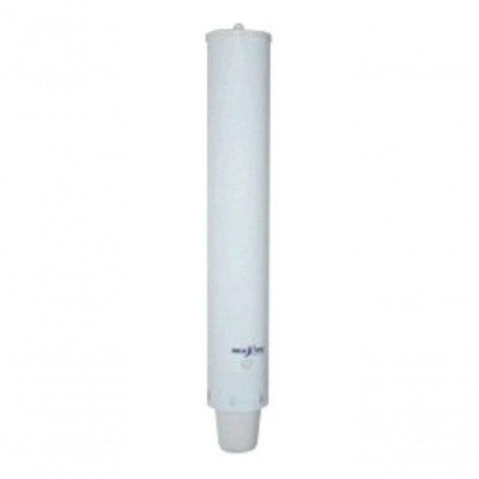 Dispenser cilíndrico para copos descartáveis de plástico, com capacidade para 100 unidades. Construído em aço carbono, com acabamento em pintura epóxi branca.