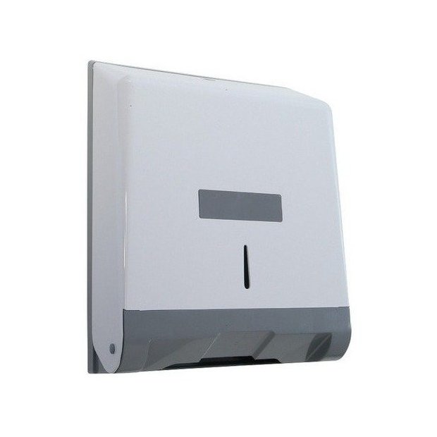 Toalheiro em ABS para papel interfolha 2 ou 3 dobras.Injetado em plástico ABS branco, visor para controle de reposição do papel e fundo cinza.O sistema de fechamento é feito através de fechadura em plástico ABS, que mantém o produto trancado, evitando, assim o furto do papel, bem como a abertura indevida da tampa do suporte.Acompanha chave plástica e kit contendo buchas e parafusos para fixação na parede.Disponível na cor: Branco/CinzaCapacidade: 900 folhas aproximadamente.Medidas: 368mm (altura) x 277mm (largura) x 120mm (profundidade).