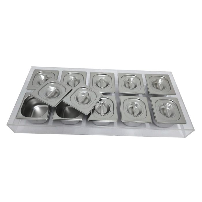DISPLAY EXPOSITOR CONDIMENTADORA EM ACRÍLICO PARA 10 CUBAS 1/6 + 10 Cubas Inox 1/6x100 + 10 Tampas S