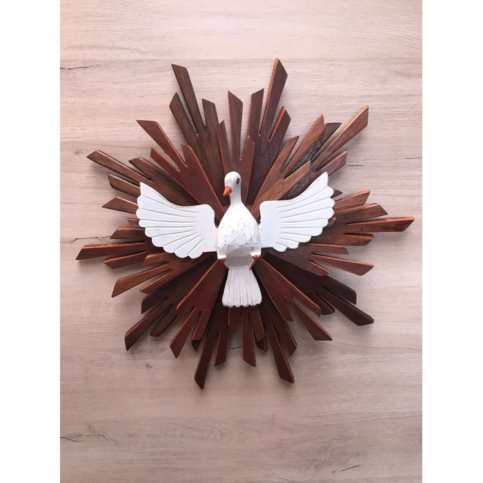 Divino Espírito Santo, todo feito em madeira, com pomba entalhada e pintada a mão, com acabamento rústico de excelente qualidade. Bastante utilizados na decoração de ambientes, este lindo divino proporciona um visual todo especial e trazendo proteção espiritual ao lar, dando um toque de estilo em qualquer local. Este produto é ideal para decoração de ambientes internos e externos, tais como, salas, escritórios, varandas e corredores.