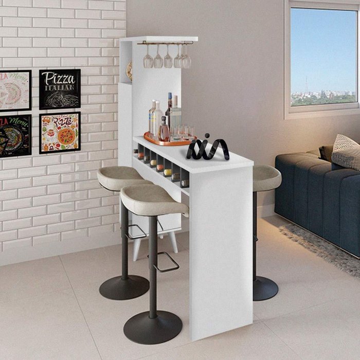Dimensões do produto: Largura: 145 cm; Profundidade 38,5 cm; Altura 165,5 cm; Altura da bancada 92,5 cm.Itens Inclusos: 1 barzinho bancada- Suporte de taças em alumínio- Adega para 8 garrafas- 1 porta e 1 prateleira interna- 2 nichos- Bancada ampla- Pode ser utilizado como separador de ambientes- Acabamento em todos os lados- Pés palito em madeira maciça- Produto em MDPComplexidade da montagem: Média, pode ser montado por apenas uma pessoa e/ou necessite de maior conhecimento para montagem.Recomendações de uso, manutenção e limpeza: Limpar com flanela ou pano macio seco, não utilizar produtos abrasivos, desengordurantes, álcool ou solvente. Não expor o produto diretamente a luz solar e à umidadeGarantia: 3 mesesOBS: Foto meramente ilustrativa, objetos e decoração não fazem parte do produto.
