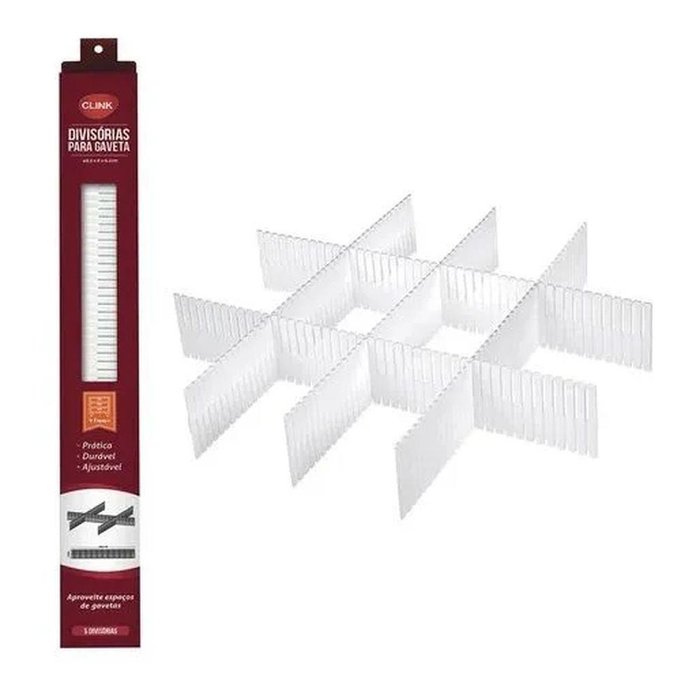 Com essa prática Divisórias Para Gaveta, você terá muito mais organização para guardar seus pertences e deixá-los com fácil acesso. Organize suas gavetas e deixe elas sempre bem arrumadas, com a ajuda da Clink isso ficou muito mais fácil. Possui 5 divisórias de 49,5 x 6, com vários "gominhos" que podem ser destacados e montados de acordo com o tamanho da sua gaveta.